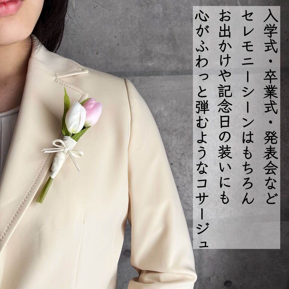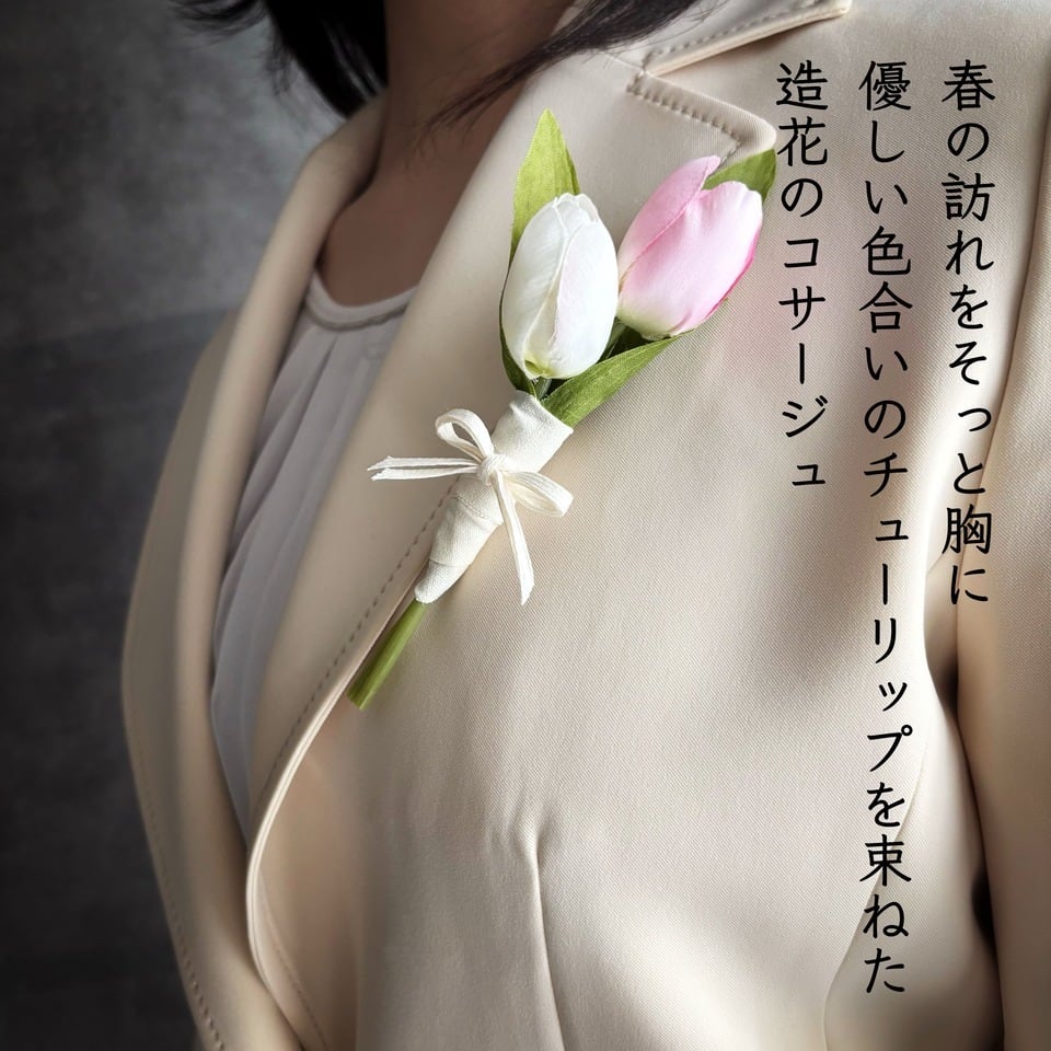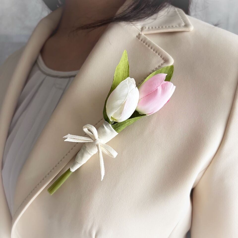 やさしい色合いのチューリップを束ねた、造花のコサージュです。