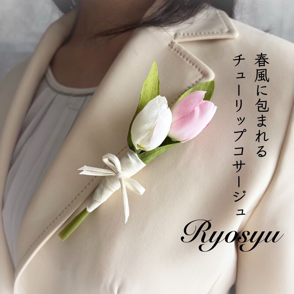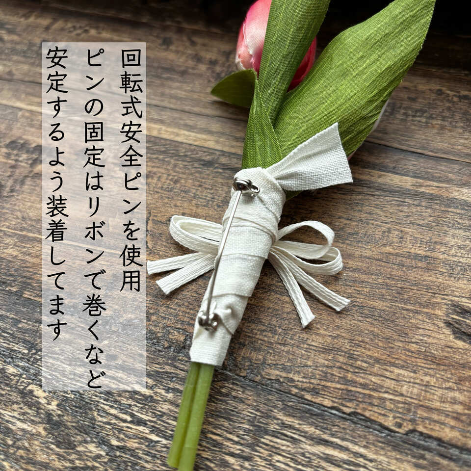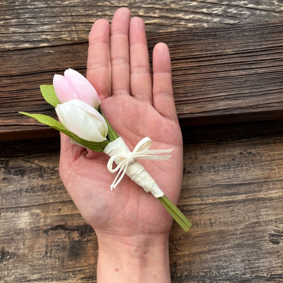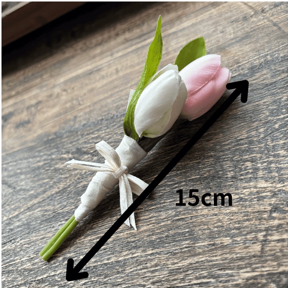 やさしい色合いのチューリップを束ねた、造花のコサージュです。
