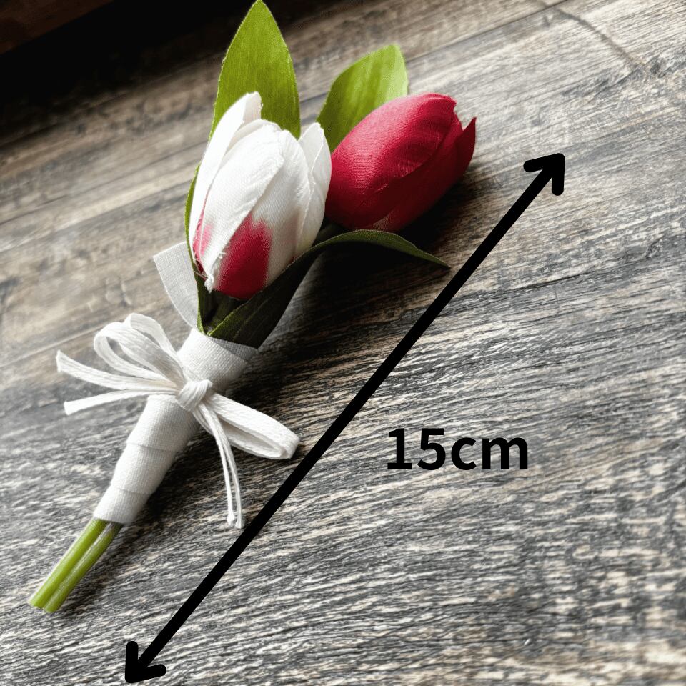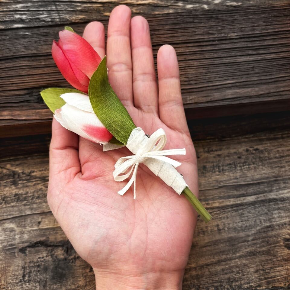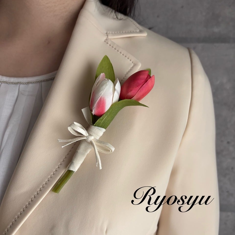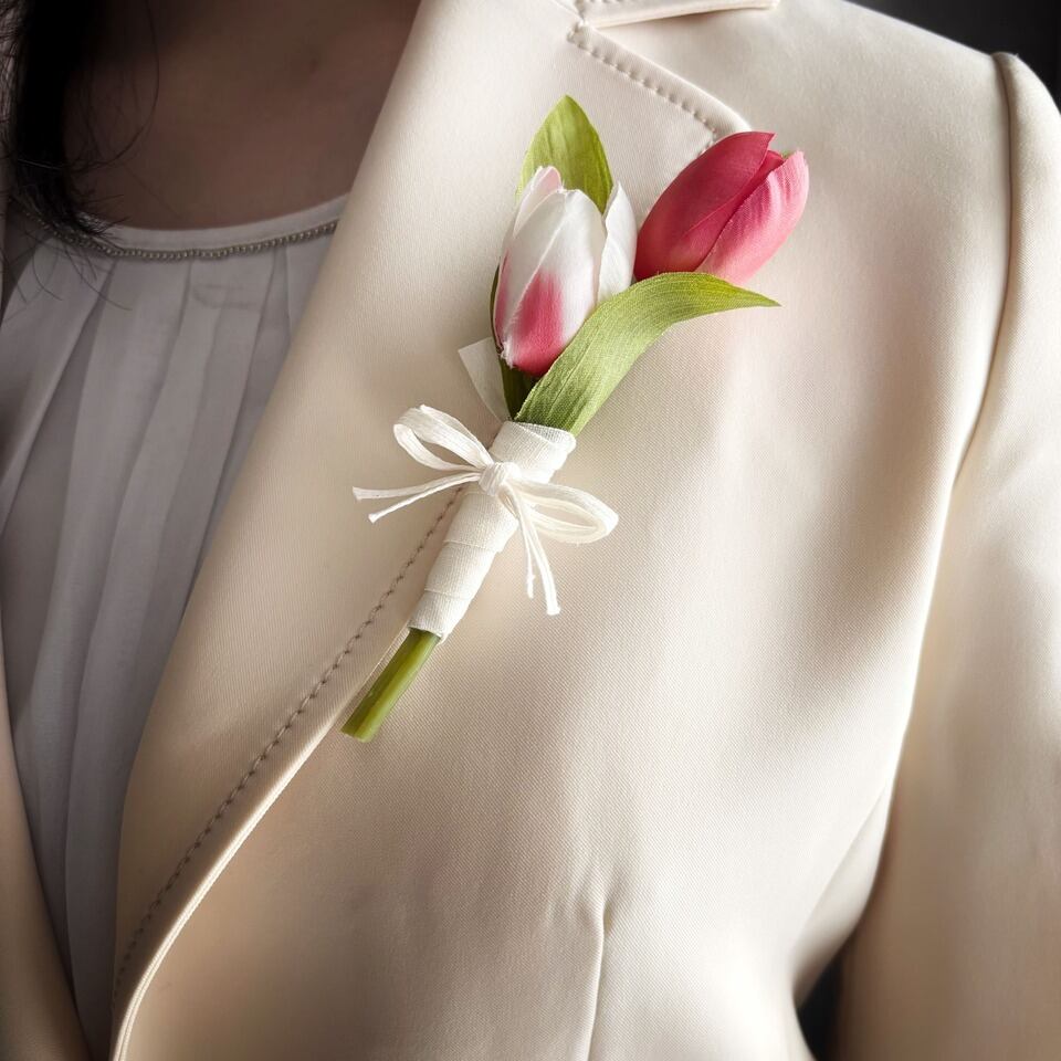 やさしい色合いのチューリップを束ねた、造花のコサージュです。